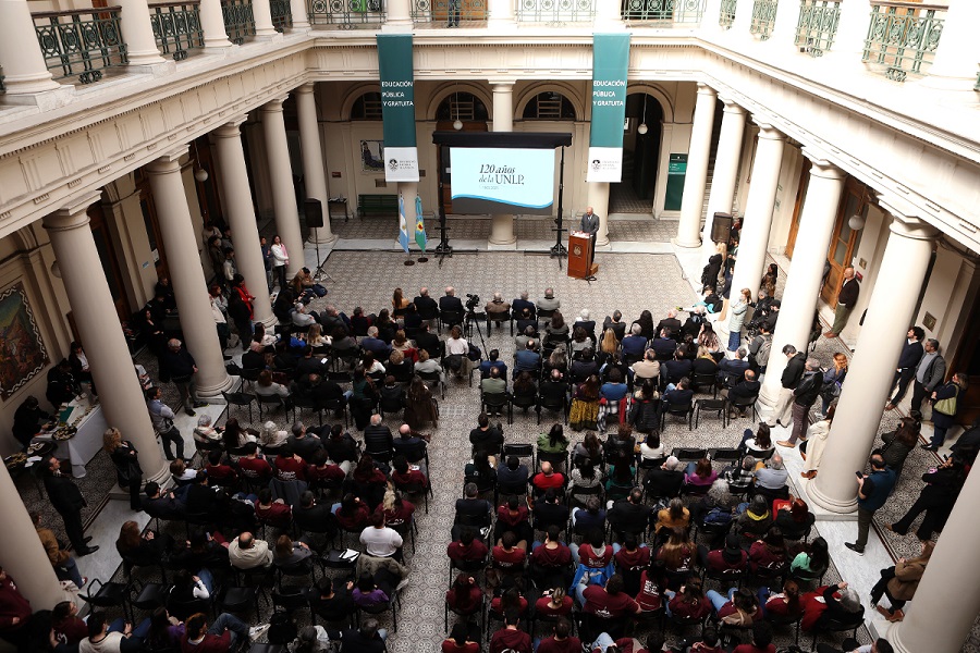 El titular de la UNLP recordó: “la Universidad Nacional de La Plata cumple 120 años de historia, presente y futuro. Nació como un proyecto moderno e integral que unió docencia, investigación y extensión, y que desde su origen entendió que la misión universitaria no es solo formar profesionales, sino también ciudadanos con conciencia, sentido de la responsabilidad y amor por la verdad”.